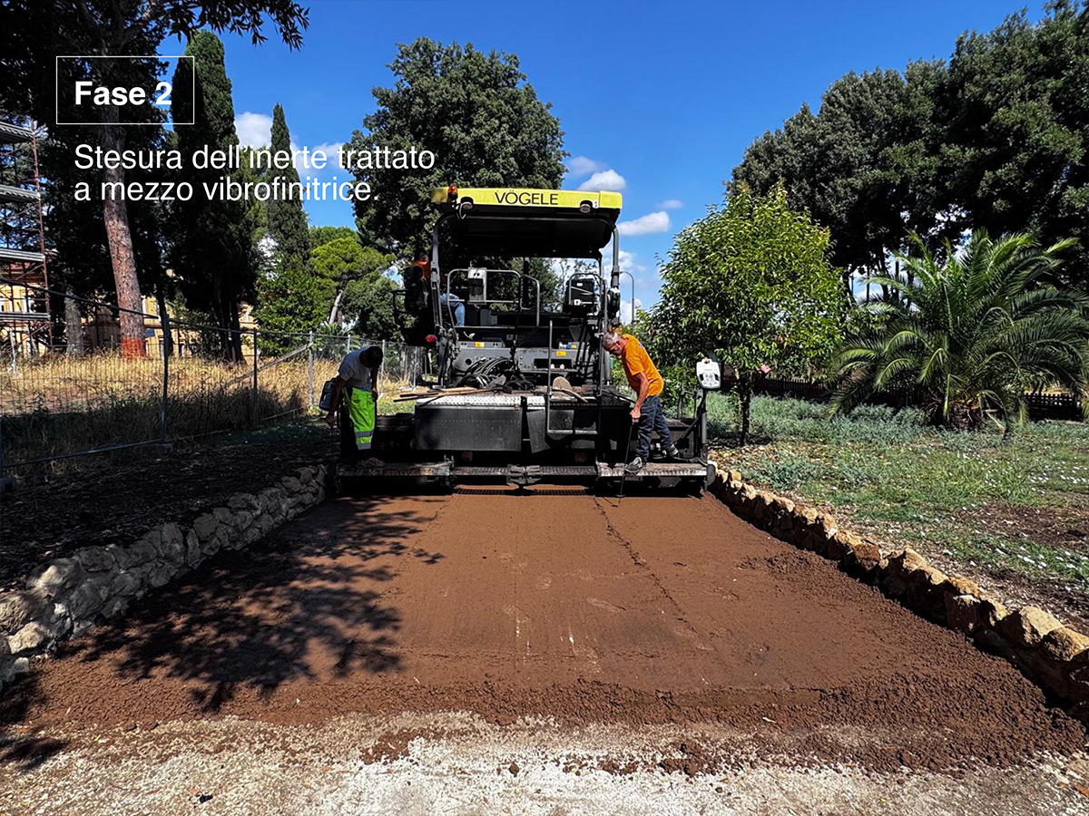 The project was born from the need to make the internal pathways more functional and resistant, while preserving the visual and material identity of the site. The first phases of the intervention, launched in autumn 2024, involved Green Ways® technicians, the Project Management Office, and the contractor ITALIA OPERE from Palestrina in a series of site inspections, laboratory tests with different types of aggregates, and on-site trials extending until spring 2025.