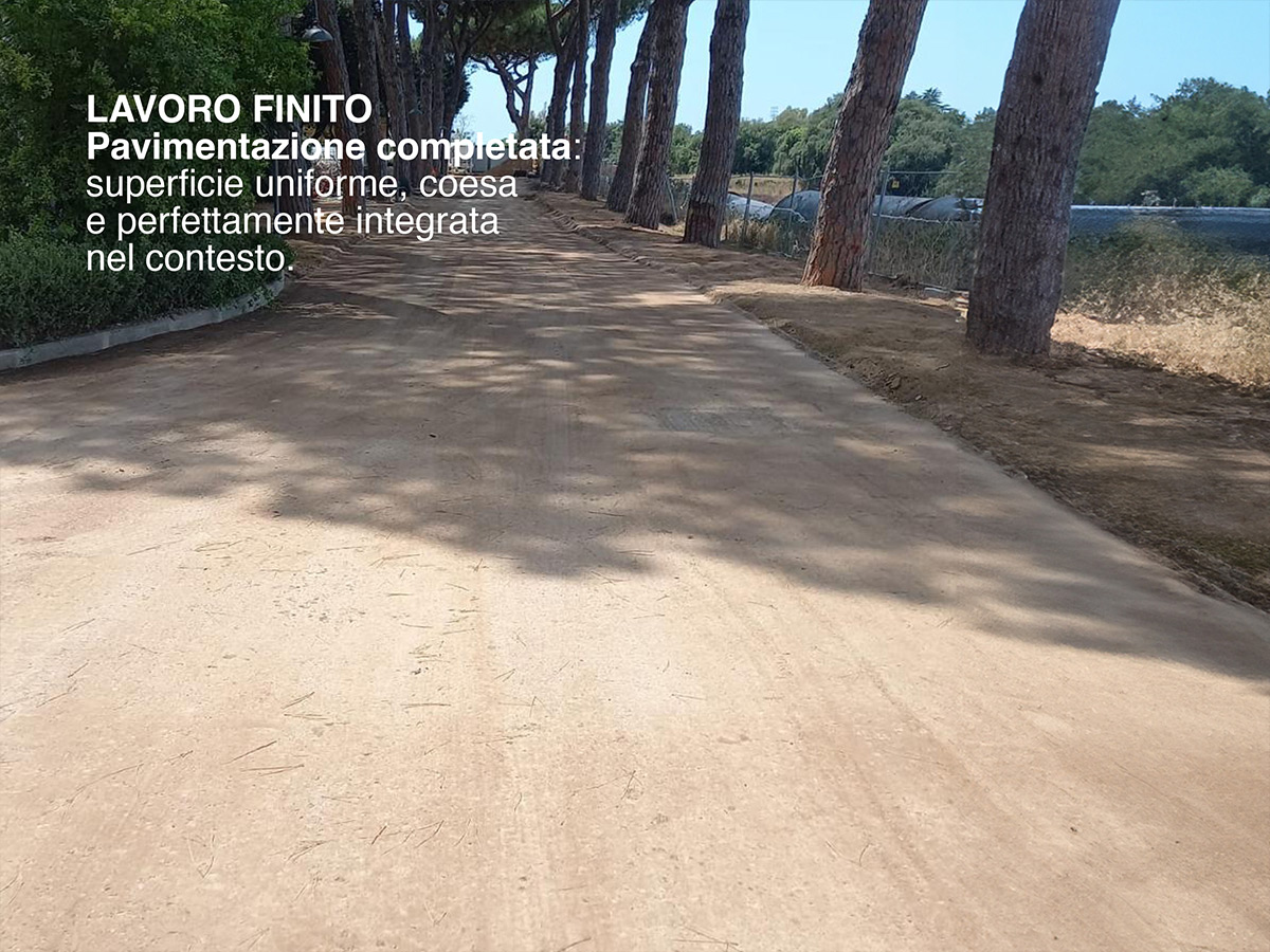 After a testing phase conducted in a laboratory accredited by the Ministry of Infrastructure, the optimal mixture was defined: tuff aggregates blended with the eco-friendly stabilizing binder Solid Pave®.